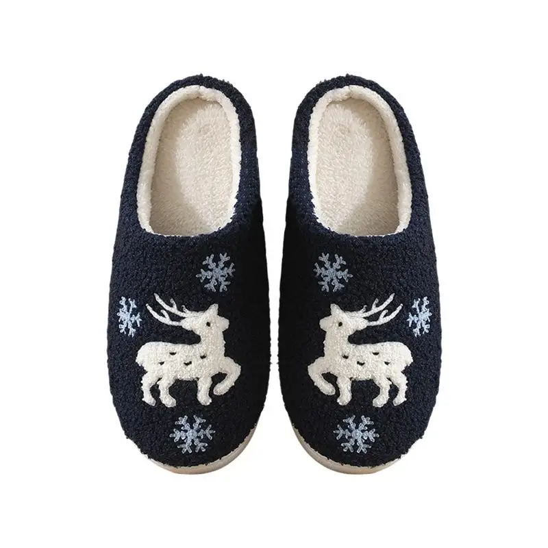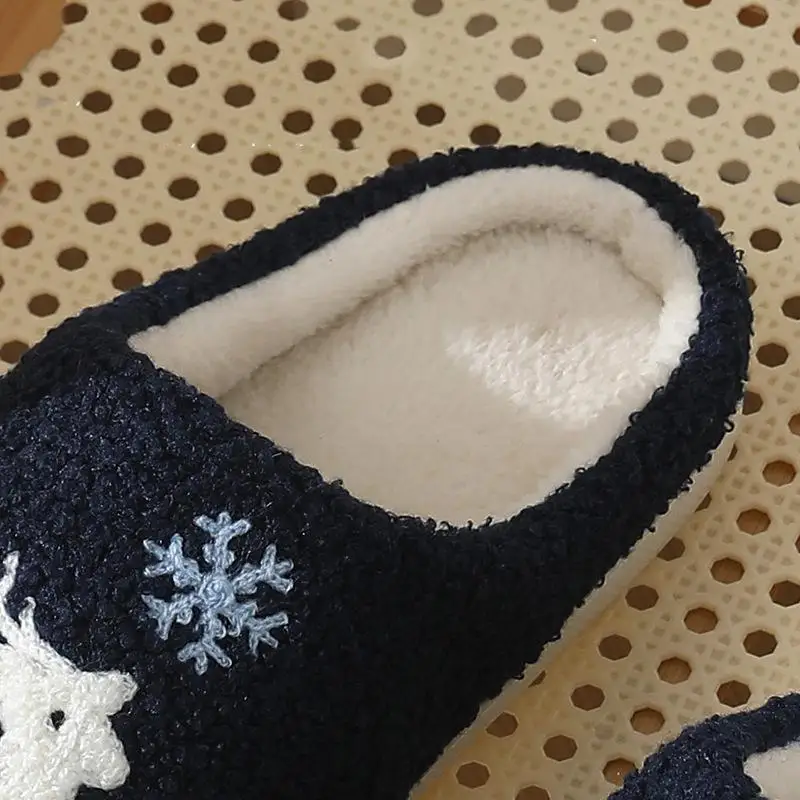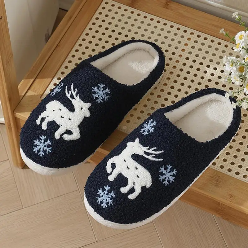Cartoon Moose Cute Plush Indoor Slippers Women 2025 Winter Warm Fluffy Fur Couple's Christmas Slippers Soft Flat Heel Slides